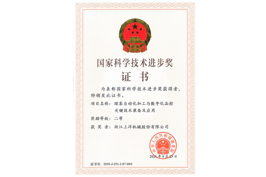 2021年11月3日,公司與安徽農業(yè)大學等單位聯(lián)合申報的《綠茶自動化加工與數(shù)字化品控關鍵技術裝備及應用》獲得國家科學技術進步獎二等獎。公司按照“品控數(shù)字化-加工自動化-技術體系化”思路,歷經14年攻關和應用,獲獎項目技術及裝備推廣至我國所有產茶?。ㄊ小^(qū))的 1200 多家茶葉企業(yè)。